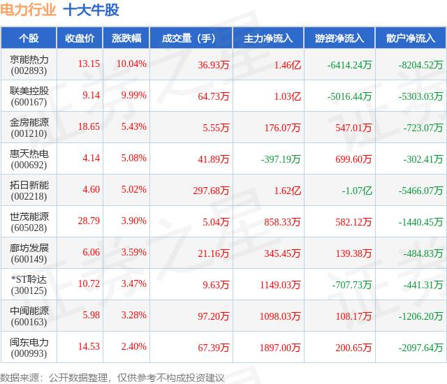 个股表现方面,电力行业当日领涨股为京能热力(002893),该股当日报收13.15,上涨10.04%,成交量36.93万,主力资金净流入1.46亿元。联美控股(600167)以上涨9.99%紧随其后,该股当日成交量64.73万,主力资金净流入1.03亿元。除此之外,金房能源(001210)、惠天热电(000692)、拓日新能(002218)均进入当日牛股之列。具体个股列表见下表: