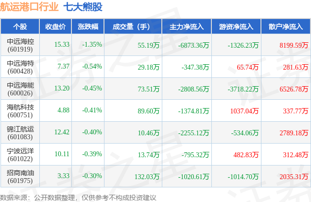个股表现方面,航运港口行业当日领跌股为中远海控(601919),该股当日报收15.33,下跌1.35%,成交量55.19万,主力资金净流出6873.36万元。中远海特(600428)以下跌0.54%紧随其后,该股当日成交量29.18万,主力资金净流出347.38万元。除此之外,中远海能(600026)、海航科技(600751)、锦江航运(601083)均进入当日熊股之列。具体个股列表见下表: