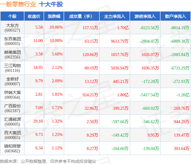 个股表现方面,一般零售行业当日领涨股为大东方(600327),该股当日报收5.58,上涨10.06%,成交量157.51万,主力资金净流入1.7亿元。东百集团(600693)以上涨10.0%紧随其后,该股当日成交量63.15万,主力资金净流入9613.79万元。除此之外,赫美集团(002356)、三江购物(601116)、全新好(000007)均进入当日牛股之列。具体个股列表见下表:
