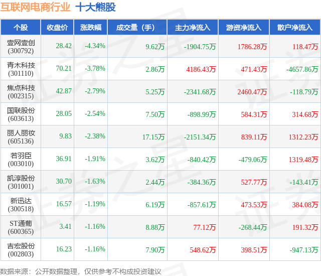 个股表现方面,互联网电商行业当日领跌股为壹网壹创(300792),该股当日报收28.42,下跌4.34%,成交量9.62万,主力资金净流出1904.75万元。青木科技(301110)以下跌3.78%紧随其后,该股当日成交量2.86万,主力资金净流入4186.43万元。除此之外,焦点科技(002315)、国联股份(603613)、丽人丽妆(605136)均进入当日熊股之列。具体个股列表见下表: