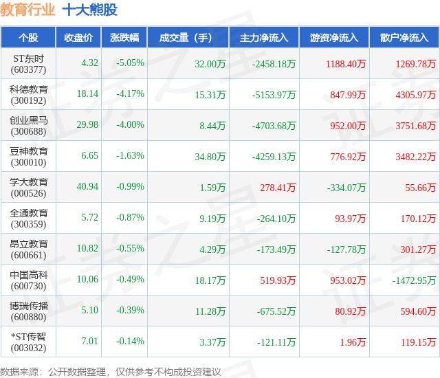 个股表现方面,教育行业当日领跌股为ST东时(603377),该股当日报收4.32,下跌5.05%,成交量32.0万,主力资金净流出2458.18万元。科德教育(300192)以下跌4.17%紧随其后,该股当日成交量15.31万,主力资金净流出5153.97万元。除此之外,创业黑马(300688)、豆神教育(300010)、学大教育(000526)均进入当日熊股之列。具体个股列表见下表:
