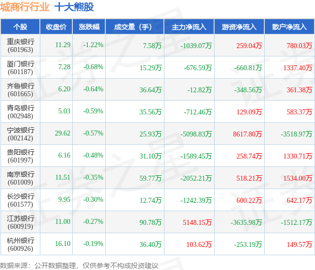 个股表现方面,城商行行业当日领跌股为重庆银行(601963),该股当日报收11.29,下跌1.22%,成交量7.58万,主力资金净流出1039.07万元。厦门银行(601187)以下跌0.68%紧随其后,该股当日成交量15.29万,主力资金净流出676.59万元。除此之外,齐鲁银行(601665)、青岛银行(002948)、宁波银行(002142)均进入当日熊股之列。具体个股列表见下表: