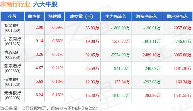 个股表现方面,农商行行业当日领涨股为紫金银行(601860),该股当日报收2.9,上涨0.69%,成交量65.83万,主力资金净流出1860.09万元。沪农商行(601825)以上涨0.66%紧随其后,该股当日成交量19.08万,主力资金净流入1550.72万元。除此之外,青农商行(002958)、张家港行(002839)、瑞丰银行(601528)均进入当日牛股之列。具体个股列表见下表: