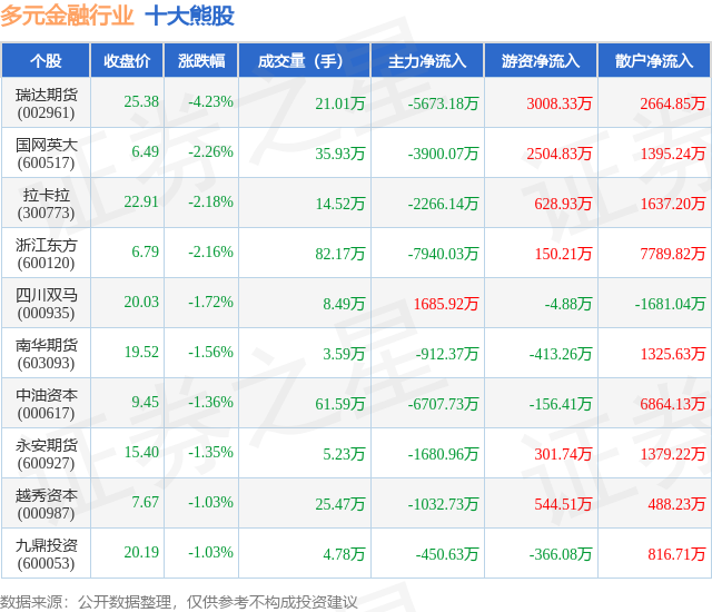 个股表现方面,多元金融行业当日领跌股为瑞达期货(002961),该股当日报收25.38,下跌4.23%,成交量21.01万,主力资金净流出5673.18万元。国网英大(600517)以下跌2.26%紧随其后,该股当日成交量35.93万,主力资金净流出3900.07万元。除此之外,拉卡拉(300773)、浙江东方(600120)、四川双马(000935)均进入当日熊股之列。具体个股列表见下表: