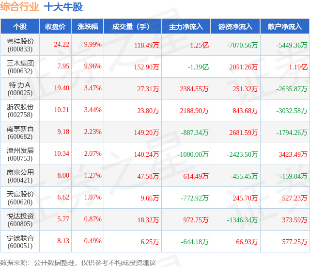 个股表现方面,综合行业当日领涨股为粤桂股份(000833),该股当日报收24.22,上涨9.99%,成交量118.49万,主力资金净流入1.25亿元。三木集团(000632)以上涨9.96%紧随其后,该股当日成交量152.9万,主力资金净流出1.39亿元。除此之外,特 力A(000025)、浙农股份(002758)、南京新百(600682)均进入当日牛股之列。具体个股列表见下表: