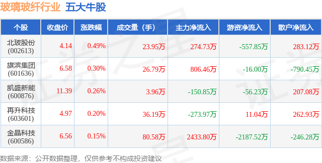 个股表现方面,玻璃玻纤行业当日领涨股为北玻股份(002613),该股当日报收4.14,上涨0.49%,成交量23.95万,主力资金净流入274.73万元。旗滨集团(601636)以上涨0.3%紧随其后,该股当日成交量26.79万,主力资金净流入806.46万元。除此之外,凯盛新能(600876)、再升科技(603601)、金晶科技(600586)均进入当日牛股之列。具体个股列表见下表: