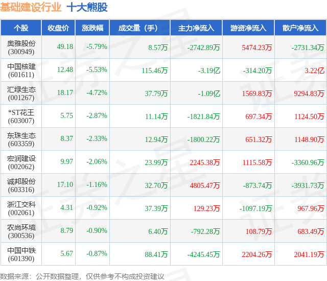 个股表现方面,基础建设行业当日领跌股为奥雅股份(300949),该股当日报收49.18,下跌5.79%,成交量8.57万,主力资金净流出2742.89万元。中国核建(601611)以下跌5.53%紧随其后,该股当日成交量115.46万,主力资金净流出3.19亿元。除此之外,汇绿生态(001267)、*ST花王(603007)、东珠生态(603359)均进入当日熊股之列。具体个股列表见下表: