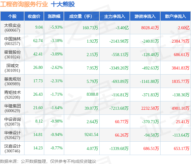 个股表现方面,工程咨询服务行业当日领跌股为太极实业(600667),该股当日报收9.04,下跌5.93%,成交量160.73万,主力资金净流出3.4亿元。中国瑞林(603257)以下跌3.18%紧随其后,该股当日成交量1.92万,主力资金净流出2143.98万元。除此之外,霍普股份(301024)、深城交(301091)、蕾奥规划(300989)均进入当日熊股之列。具体个股列表见下表: