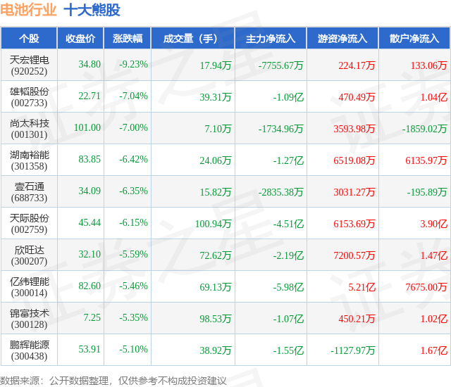 个股表现方面,电池行业当日领跌股为天宏锂电(920252),该股当日报收34.8,下跌9.23%,成交量17.94万,主力资金净流出7755.67万元。雄韬股份(002733)以下跌7.04%紧随其后,该股当日成交量39.31万,主力资金净流出1.09亿元。除此之外,尚太科技(001301)、湖南裕能(301358)、壹石通(688733)均进入当日熊股之列。具体个股列表见下表: