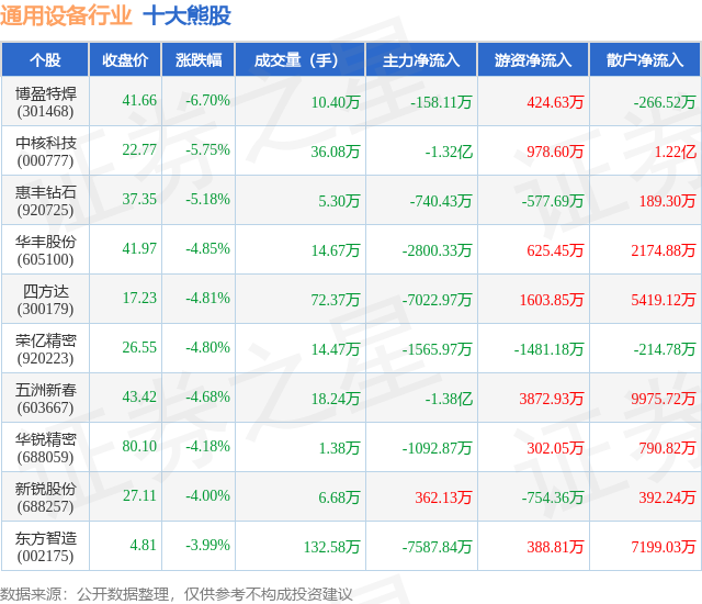 个股表现方面,通用设备行业当日领跌股为博盈特焊(301468),该股当日报收41.66,下跌6.7%,成交量10.4万,主力资金净流出158.11万元。中核科技(000777)以下跌5.75%紧随其后,该股当日成交量36.08万,主力资金净流出1.32亿元。除此之外,惠丰钻石(920725)、华丰股份(605100)、四方达(300179)均进入当日熊股之列。具体个股列表见下表: