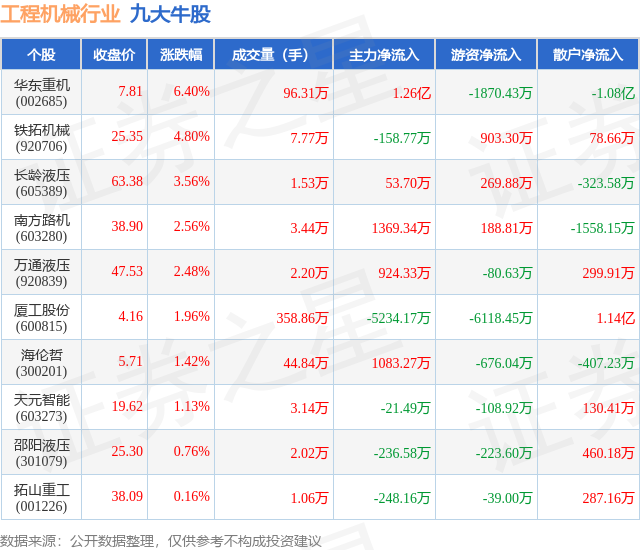 个股表现方面,工程机械行业当日领涨股为华东重机(002685),该股当日报收7.81,上涨6.4%,成交量96.31万,主力资金净流入1.26亿元。铁拓机械(920706)以上涨4.8%紧随其后,该股当日成交量7.77万,主力资金净流出158.77万元。除此之外,长龄液压(605389)、南方路机(603280)、万通液压(920839)均进入当日牛股之列。具体个股列表见下表: