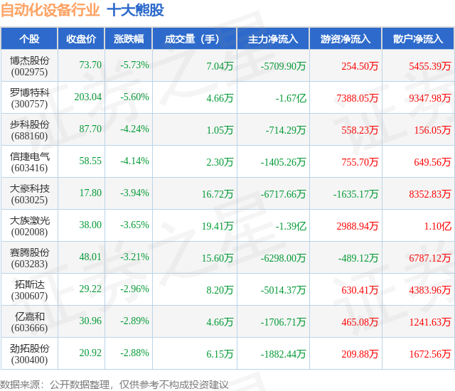 个股表现方面,自动化设备行业当日领跌股为博杰股份(002975),该股当日报收73.7,下跌5.73%,成交量7.04万,主力资金净流出5709.9万元。罗博特科(300757)以下跌5.6%紧随其后,该股当日成交量4.66万,主力资金净流出1.67亿元。除此之外,步科股份(688160)、信捷电气(603416)、大豪科技(603025)均进入当日熊股之列。具体个股列表见下表: