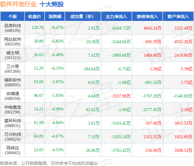个股表现方面,软件开发行业当日领跌股为品茗科技(688109),该股当日报收128.78,下跌8.47%,成交量2.91万,主力资金净流出6264.73万元。网达软件(603189)以下跌6.81%紧随其后,该股当日成交量19.58万,主力资金净流出5244.66万元。除此之外,威士顿(301315)、三六零(601360)、福昕软件(688095)均进入当日熊股之列。具体个股列表见下表:
