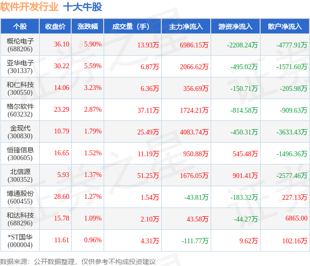 个股表现方面,软件开发行业当日领涨股为概伦电子(688206),该股当日报收36.1,上涨5.9%,成交量13.93万,主力资金净流入6986.15万元。亚华电子(301337)以上涨5.59%紧随其后,该股当日成交量6.87万,主力资金净流入2066.62万元。除此之外,和仁科技(300550)、格尔软件(603232)、金现代(300830)均进入当日牛股之列。具体个股列表见下表: