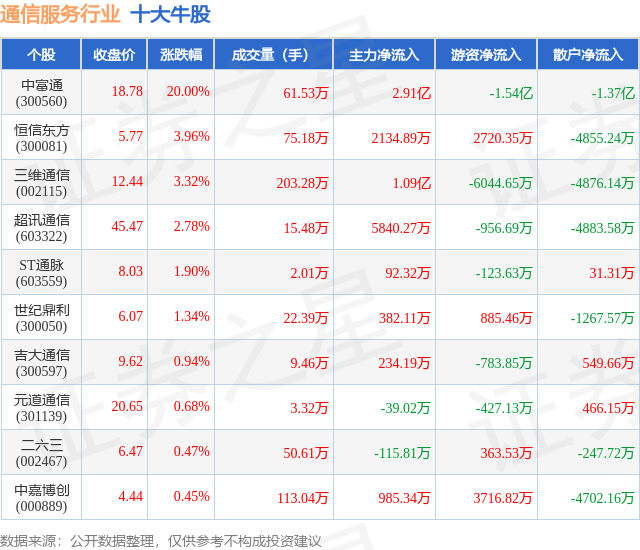 个股表现方面,通信服务行业当日领涨股为中富通(300560),该股当日报收18.78,上涨20.0%,成交量61.53万,主力资金净流入2.91亿元。恒信东方(300081)以上涨3.96%紧随其后,该股当日成交量75.18万,主力资金净流入2134.89万元。除此之外,三维通信(002115)、超讯通信(603322)、ST通脉(603559)均进入当日牛股之列。具体个股列表见下表: