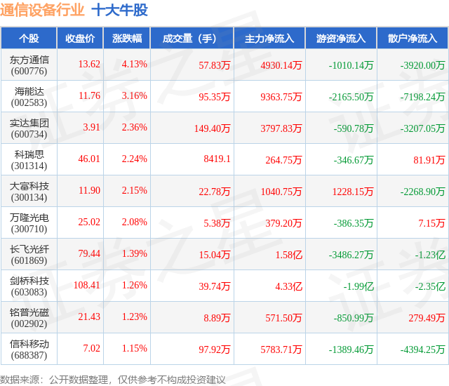 个股表现方面,通信设备行业当日领涨股为东方通信(600776),该股当日报收13.62,上涨4.13%,成交量57.83万,主力资金净流入4930.14万元。海能达(002583)以上涨3.16%紧随其后,该股当日成交量95.35万,主力资金净流入9363.75万元。除此之外,实达集团(600734)、科瑞思(301314)、大富科技(300134)均进入当日牛股之列。具体个股列表见下表: