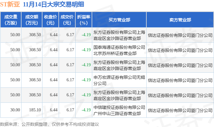 证券之星消息,11月14日ST新亚发生大宗交易,交易数据如下: