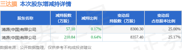 证券之星消息,11月14日三达膜发布公告《三达膜:关于持股5%以上股东减持股份进展暨权益变动触及5%整数倍的提示性公告》,其股东清源(中国)有限公司于2025年10月29日至2025年11月13日间合计减持267.93万股,占公司目前总股本的0.807%,变动期间该股股价上涨4.45%,截止11月13日收盘报17.84元。