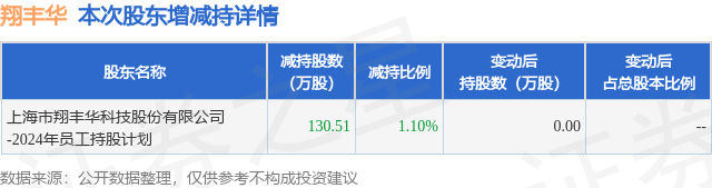 证券之星消息,11月14日翔丰华发布公告《翔丰华:关于2024年员工持股计划减持完毕暨提前终止的公告》,其股东上海市翔丰华科技股份有限公司-2024年员工持股计划于2025年9月20日至2025年11月12日间合计减持130.51万股,占公司目前总股本的1.0964%,变动期间该股股价上涨13.82%,截止11月12日收盘报36.41元。