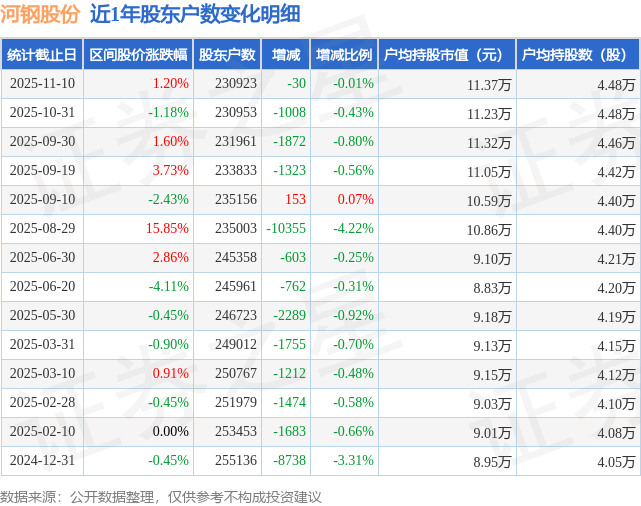 从股价来看,2025年10月31日至2025年11月10日,河钢股份区间涨幅为1.2%,在此期间股东户数减少30.0户,减幅为0.01%。