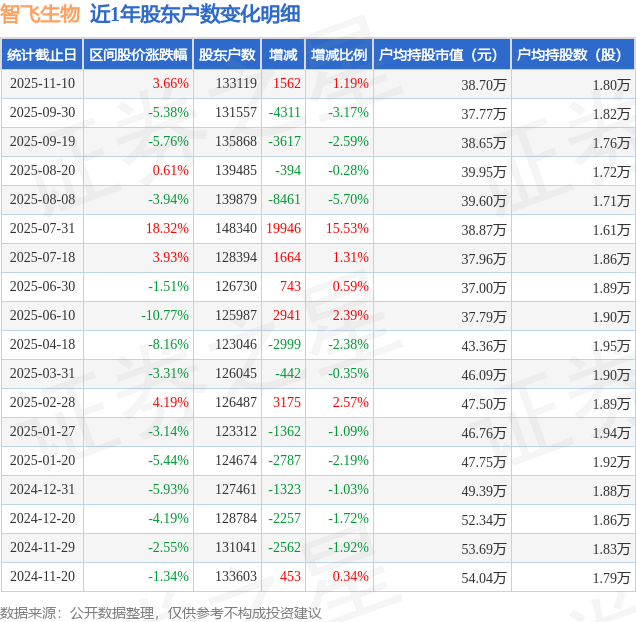 从股价来看,2025年9月30日至2025年11月10日,智飞生物区间涨幅为3.66%,在此期间股东户数增加1562.0户,增幅为1.19%。
