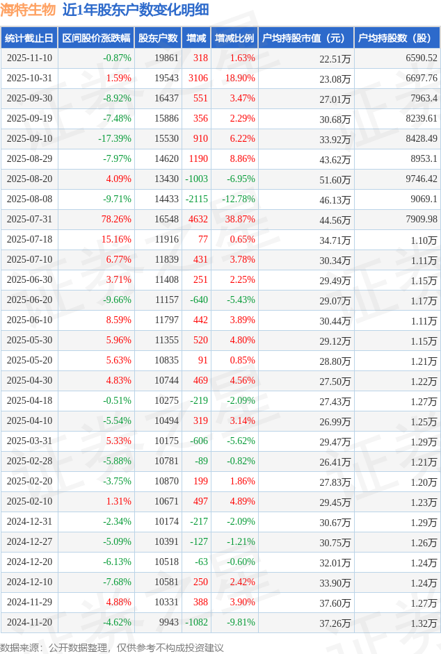 从股价来看,2025年10月31日至2025年11月10日,海特生物区间跌幅为0.87%,在此期间股东户数增加318.0户,增幅为1.63%。