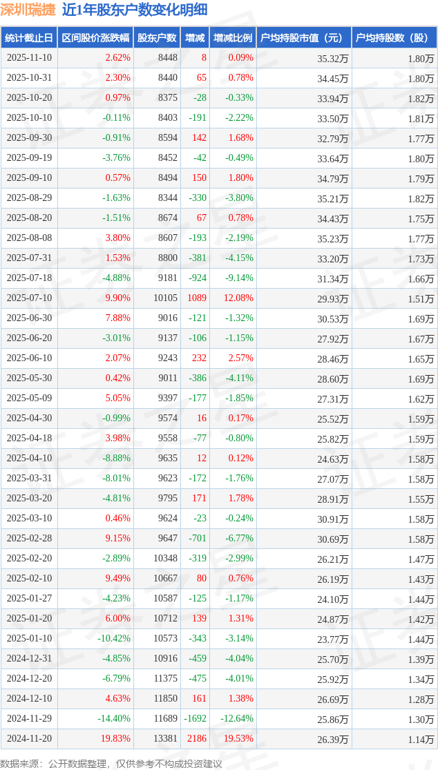 从股价来看,2025年10月31日至2025年11月10日,深圳瑞捷区间涨幅为2.62%,在此期间股东户数增加8.0户,增幅为0.09%。