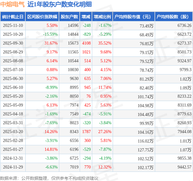 从股价来看,2025年10月20日至2025年11月10日,中熔电气区间涨幅为5.5%,在此期间股东户数减少248.0户,减幅为1.67%。