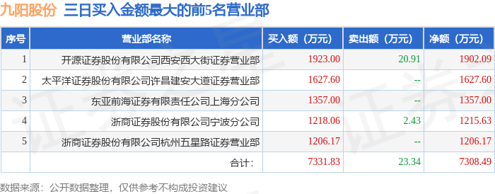 证券之星消息,沪深交易所2025年11月14日公布的交易公开信息显示,九阳股份(002242)因连续三个交易日内,涨幅偏离值累计达到20%的证券登上龙虎榜。此次是近5个交易日内第1次上榜。