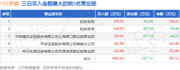 证券之星消息,沪深交易所2025年11月14日公布的交易公开信息显示,*ST步森(002569)因连续三个交易日内,涨幅偏离值累计达到12%的ST证券、*ST证券和未完成股改证券登上龙虎榜。此次是近5个交易日内第1次上榜。