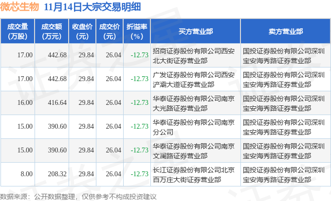 证券之星消息,11月14日微芯生物发生大宗交易,交易数据如下: