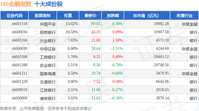 证券之星消息,11月14日,180金融(000018)指数报收于5913.16点,跌0.24%,成交459.34亿元,换手率0.3%。当日该指数成份股中,上涨的有13家,兴业银行以1.5%的涨幅领涨,下跌的有25家,华泰证券以2.93%的跌幅领跌。