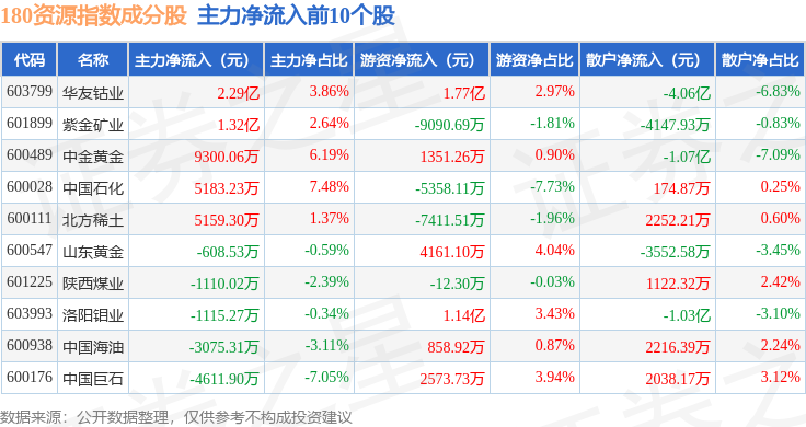资金流向方面,180资源(000026)指数成份股当日主力资金净流出合计12.07亿元,游资资金净流入合计6.74亿元,散户资金净流入合计5.33亿元。成份股资金流向详情见下表: