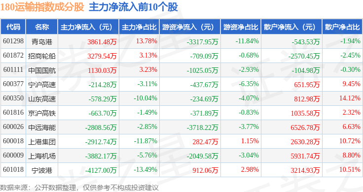 资金流向方面,180运输(000027)指数成份股当日主力资金净流出合计2.71亿元,游资资金净流出合计9358.51万元,散户资金净流入合计3.65亿元。成份股资金流向详情见下表:
