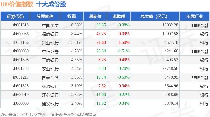 证券之星消息,11月14日,180价值(000029)指数报收于4471.84点,跌0.36%,成交599.71亿元,换手率0.32%。当日该指数成份股中,上涨的有17家,兴业银行以1.5%的涨幅领涨,下跌的有40家,华泰证券以2.93%的跌幅领跌。