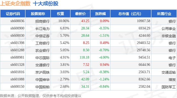 上证央企(000042)指数十大成份股详情如下: