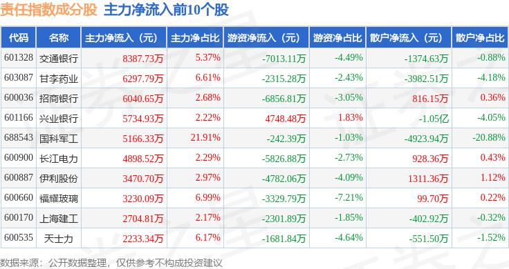 资金流向方面,责任指数(000048)成份股当日主力资金净流出合计24.65亿元,游资资金净流入合计10.26亿元,散户资金净流入合计14.39亿元。成份股资金流向详情见下表: