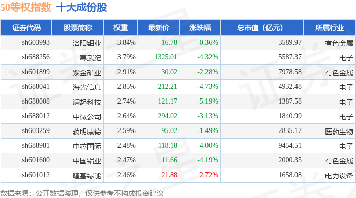 证券之星消息,11月14日,50等权(000050)指数报收于2445.63点,跌1.43%,成交1203.76亿元,换手率0.29%。当日该指数成份股中,上涨的有9家,隆基绿能以2.72%的涨幅领涨,下跌的有41家,澜起科技以5.19%的跌幅领跌。