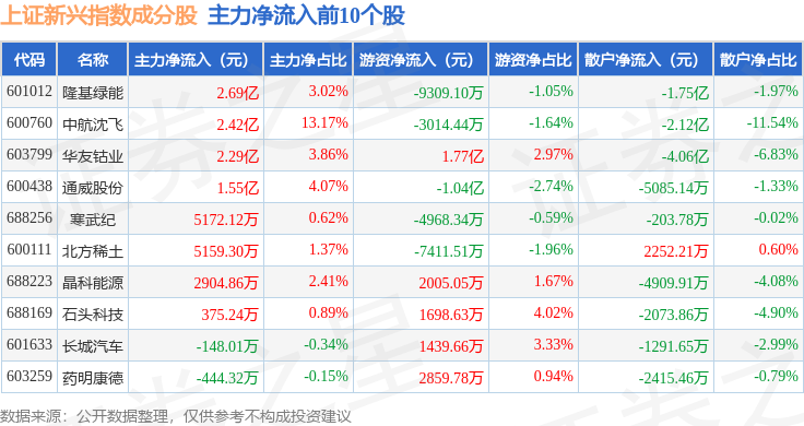 资金流向方面,上证新兴(000067)指数成份股当日主力资金净流出合计84.51亿元,游资资金净流入合计47.12亿元,散户资金净流入合计37.38亿元。成份股资金流向详情见下表: