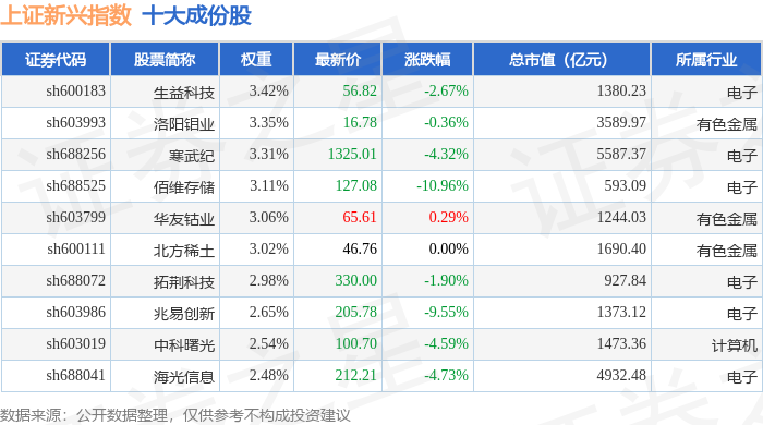 证券之星消息,11月14日,上证新兴(000067)指数报收于8830.95点,跌2.33%,成交1245.22亿元,换手率1.26%。当日该指数成份股中,上涨的有6家,隆基绿能以2.72%的涨幅领涨,下跌的有43家,佰维存储以10.96%的跌幅领跌。