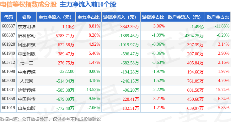 资金流向方面,电信等权(000078)指数成份股当日主力资金净流出合计14.2亿元,游资资金净流入合计7.5亿元,散户资金净流入合计6.7亿元。成份股资金流向详情见下表: