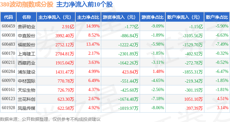 资金流向方面,380波动(000130)指数成份股当日主力资金净流出合计24.22亿元,游资资金净流入合计3.33亿元,散户资金净流入合计20.9亿元。成份股资金流向详情见下表: