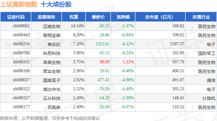 证券之星消息,11月14日,上证高新(000131)指数报收于3641.23点,跌1.65%,成交314.29亿元,换手率1.35%。当日该指数成份股中,上涨的有6家,概伦电子以5.9%的涨幅领涨,下跌的有44家,国盾量子以4.9%的跌幅领跌。