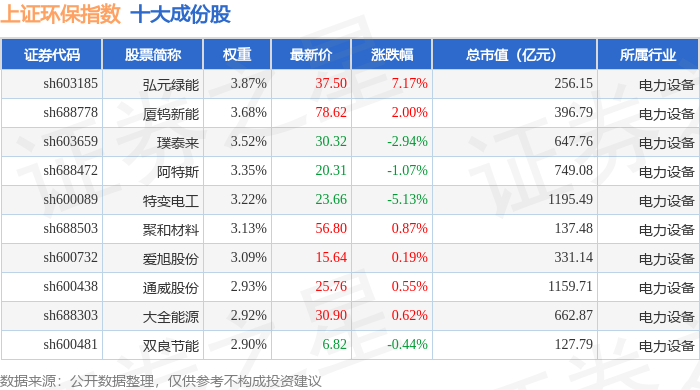 上证环保(000158)指数十大成份股详情如下: