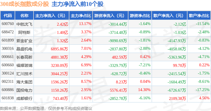 资金流向方面,300成长(000918)指数成份股当日主力资金净流出合计124.44亿元,游资资金净流入合计64.35亿元,散户资金净流入合计60.1亿元。成份股资金流向详情见下表:
