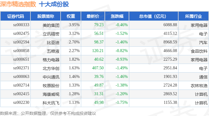 深市精选(399013)指数十大成份股详情如下: