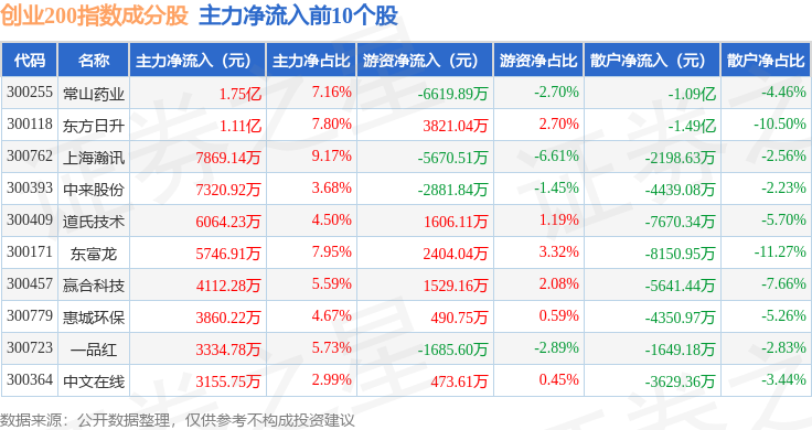 资金流向方面,创业200(399019)指数成份股当日主力资金净流出合计68.85亿元,游资资金净流入合计15.29亿元,散户资金净流入合计53.56亿元。成份股资金流向详情见下表: