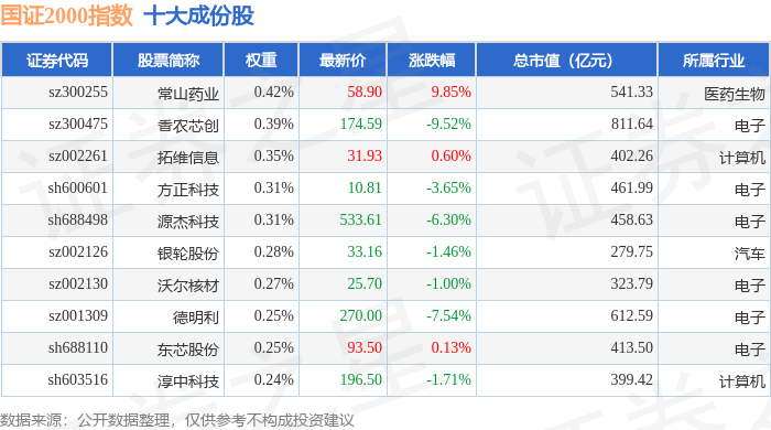 证券之星消息,11月14日,国证2000(399303)指数报收于9771.28点,跌1.07%,成交6298.67亿元,换手率3.46%。当日该指数成份股中,上涨的有615家,漱玉平民以20.03%的涨幅领涨,下跌的有1327家,同有科技以12.08%的跌幅领跌。