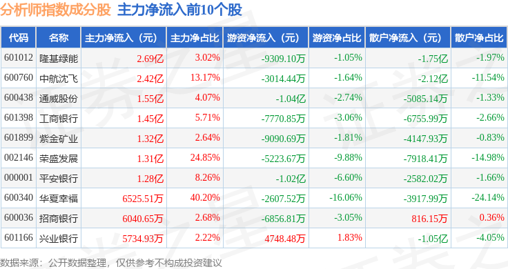 资金流向方面,分析师指数(399354)成份股当日主力资金净流出合计59.92亿元,游资资金净流入合计26.46亿元,散户资金净流入合计33.46亿元。成份股资金流向详情见下表: