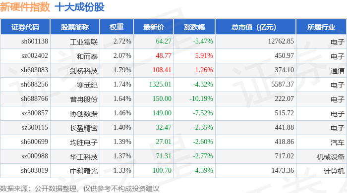 证券之星消息,11月14日,新硬件(399360)指数报收于7407.37点,跌2.08%,成交963.22亿元,换手率1.89%。当日该指数成份股中,上涨的有15家,和而泰以5.91%的涨幅领涨,下跌的有82家,普冉股份以10.19%的跌幅领跌。